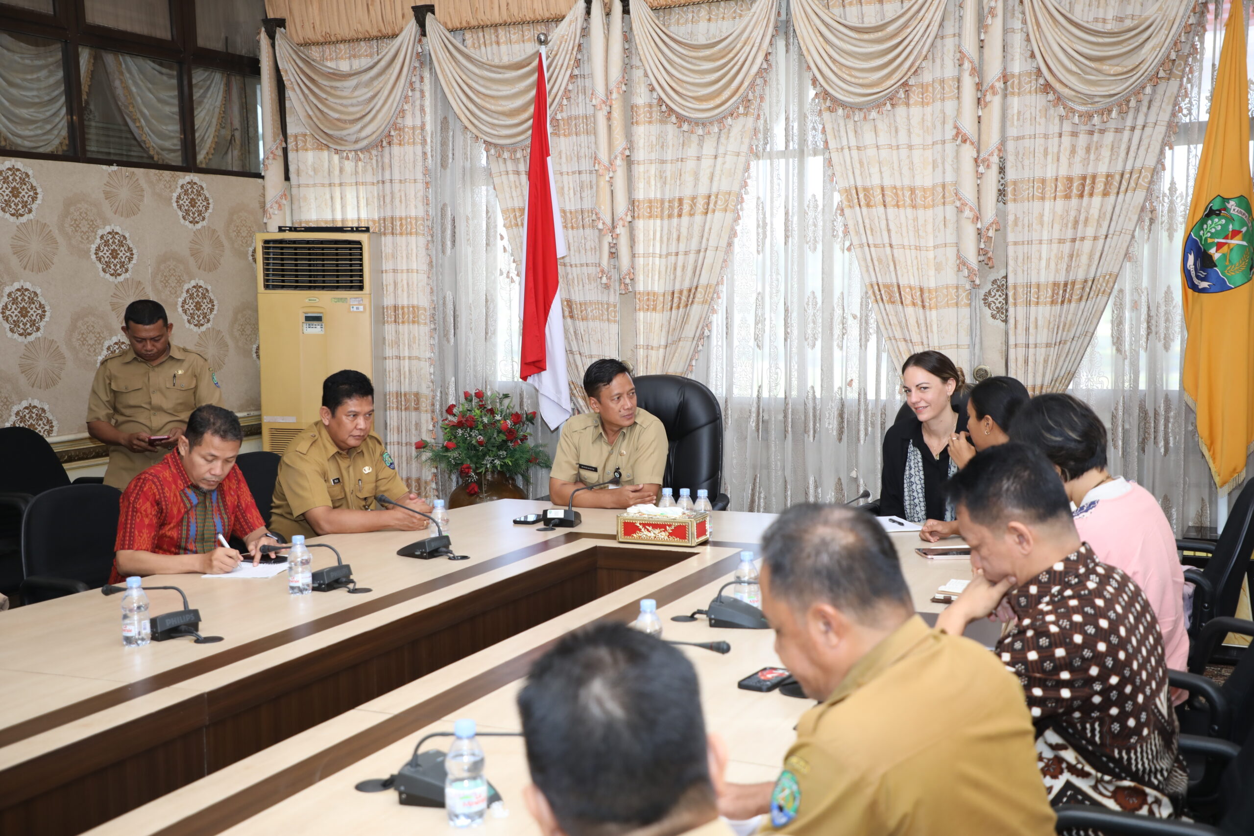 BERSUA : Perwakilan Bank Dunia, Ahli Pembangunan Sosial, Hannah Duncan berserta tim yang berkunjung langsung ke Bumi Tenguyun, disambut oleh Sekda Risdianto, S.Pi.,M.Si di Ruang Rapat Bupati, Senin (19/08/2024).