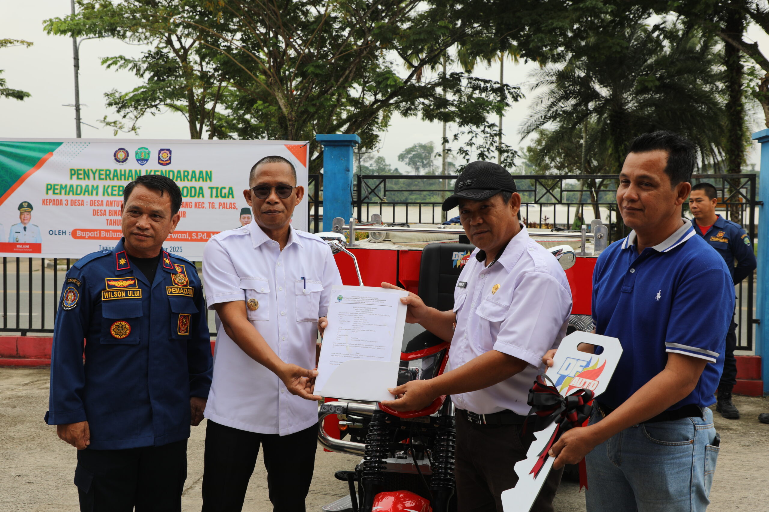 BulunganKU.ID – Bupati Bulungan, Syarwanu, S.Pd., M.Si., menyerahkan bantuan kendaraan pemadam kebakaran (damkar) roda tiga kepada tiga desa di halaman Kantor Dinas PMK dan Satpol PP pada Rabu (24/9/2025).